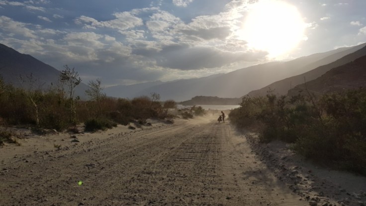 – Sand! Es fühlt sich an als ob du darin versinken würdest. Ich sehe den Sand kommen und jedes Mal hoffe ich, dass es doch diesmal eventuell mit dem Schwung reichen würde über eben diesen hinwegzugleiten. Nein! Es reicht nie! Niemals! Du bleibst wie in frischen Beton stecken. Einzige Lösung, schieben. Teilweise sind diese sandigen Strecken bis zu einem Kilometer lang und es stellt sich jedes Mal die Frage ob es vieleicht jetzt wieder klappen könnte mit Fahren, nur um einige Meter später vom Gegenteil überzeugt zu werden.