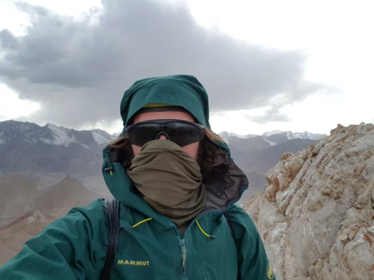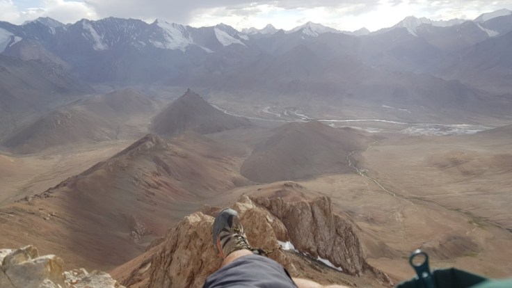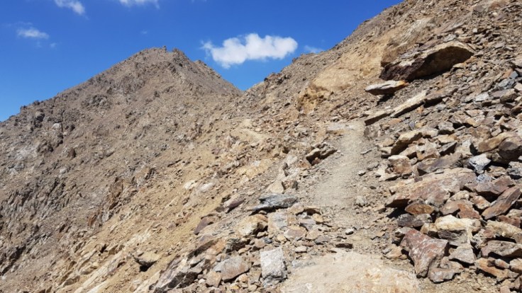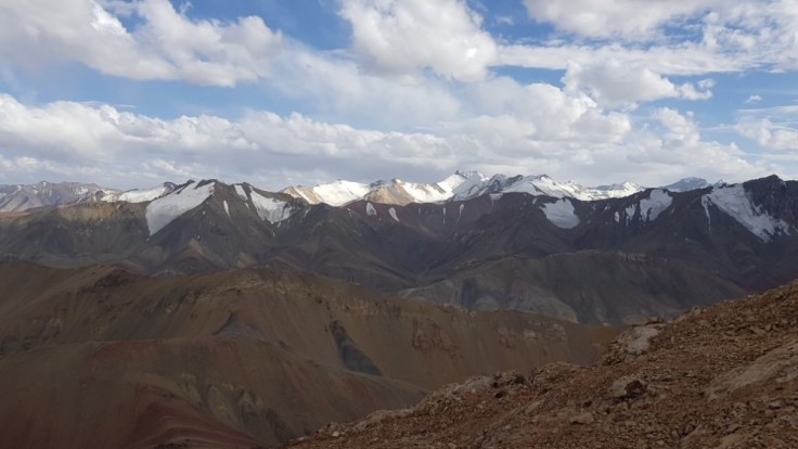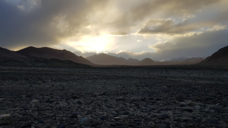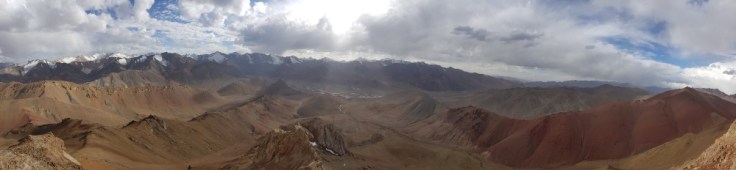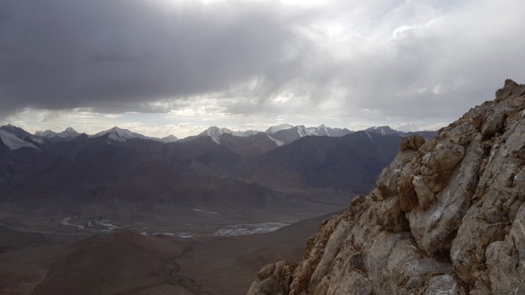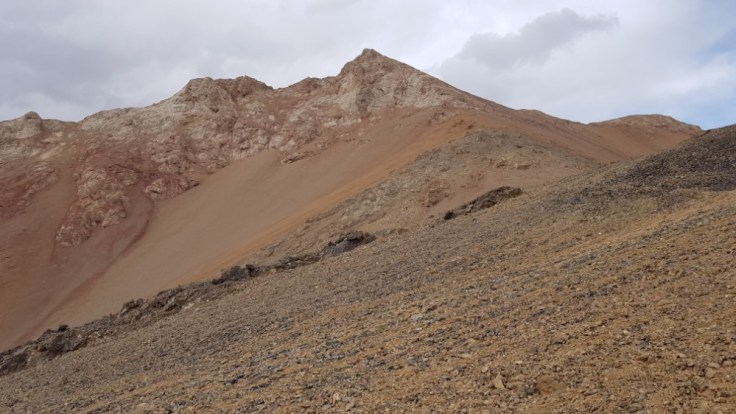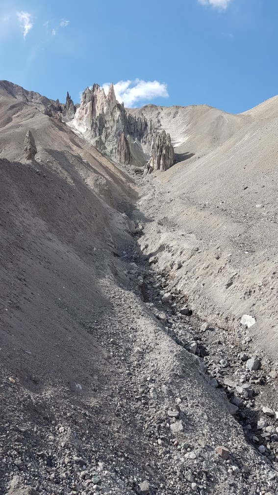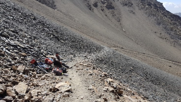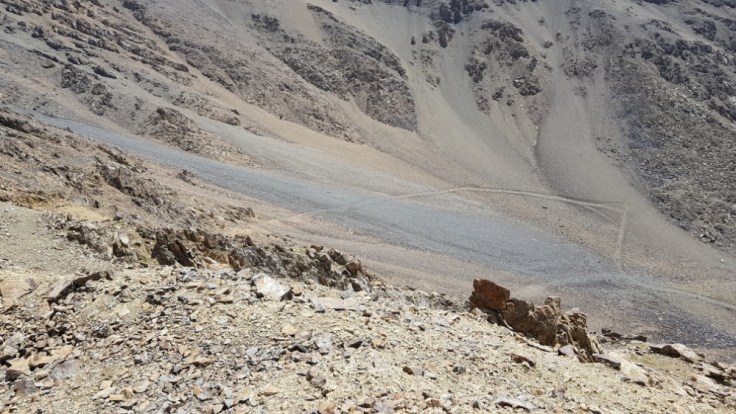 Der Berg ist nicht ganz ohne. Kiesige Hänge gespickt mit einigen Felsen, welche es zu beklettern galt. Bouldern macht mir Spass und ich suchte die Herrausvorderung. Rückblickend eventuell bisschen Leichtsinnig? Denn nur schon ein böser Misstritt hätte mich wohl einige Stunden bis in die Nacht gefangen gehalten. Aber im Moment richtig Geil! Sich den Berg hochzukämpfen. Besonders die letzten 200 Höhenmeter waren anspruchsvoll. Ihr fragt nach meiner Erfahrung? Die habe ich! Zwei Monate Bouldern und eine Doku über die Deutschen Gebirgsspezialisten. Ich denke das befugt mich auf 5000 Meter im Nirgendwo in den Bergen rumzuklettern. Die Spitze heil erreicht habe ich soeben meinen ersten 5000er bestiegen. 5102 Meter über Meer. Und es wird sicher nicht der letzte sein in meinem Leben. Der Abstieg war noch deutlich kräftezehrender als der Anstieg. Denn es gab nur die Möglichkeit über diese Kiesfelder nach unten zu gelangen. Misstrittgefahr lauerte bei jedem Schritt über diesen steilen Hang zurück zu meinem Fahrrad.