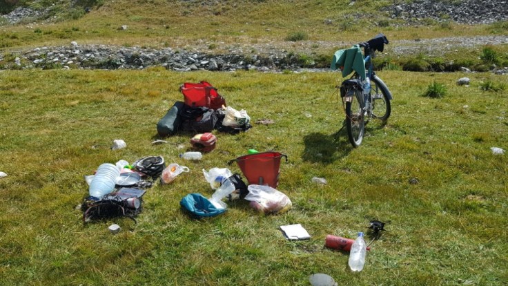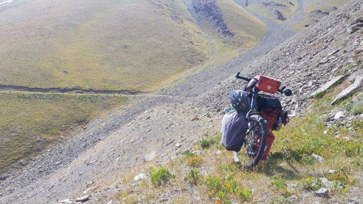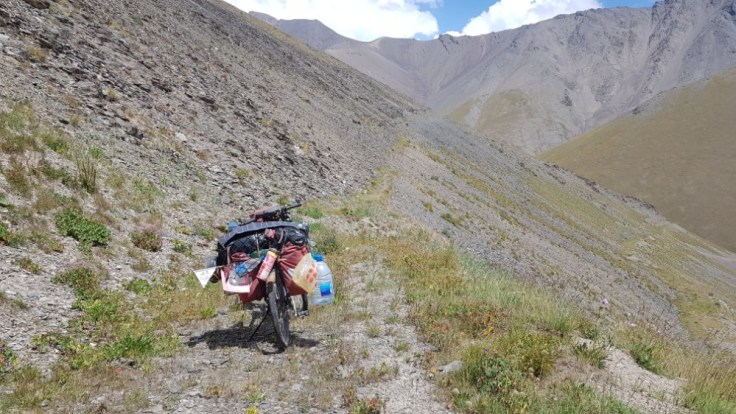 Doch dann hatte meine Soviet Strasse keine Lust mehr und die Strasse wurde zu einem kleinen steilen Wanderweg. Schieben war nun grundsätzlich angesagt. Grosse Geröllabschnitte überzogen den Weg, welche zum Laufen nicht ein Problem darstellen würden, mit einem um die 50kg Fahrrad aber einen massiven Kraftaufwand darstellten. Und nun war der Punkt erreicht worauf ich eigentlich keine Lust hatte, die Taschen mussten weg und das Fahrrad seperat hochgeschoben werden. Danach zurücklaufen Taschen holen usw. Ihr kennt ja das Prozedere von meinem Schneepass in Italien schon. 1.5 Kilometer vor der Passhöhe wurde es dann schon recht kalt und auch der Wind hatte deutlich angezogen. Mit der Einschätzung das ich die letzen 1.5 Kilometer und um die 250 Höhenmeter nicht mehr Heuter schaffen würde, schlug ich mein Zelt auf. Gute Entscheidung, denn kurz darauf fing es an zu schneien. Fazit vom Tag 7 Stunden für 8.5 Kilometer.