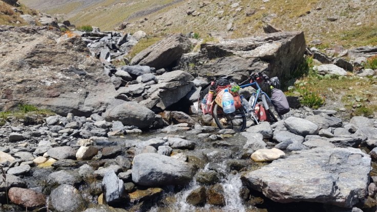Die ersten 15 Kilometer vom Dorf waren noch kein Problem für mich. Danach stiess ich auf die ersten Flussquerungen, easy! Und nun wurde mir bewusst was eine alte Soviet Strasse ist. Eine etwas breitere Grassfläche welche gespickt mit Steinen und Büschen serpentinenartig sich den Berg hochschlängelt. Ich dachte an Pflasterstein oder soetwas. Da hatte ich einen kurzen Moment von Zweifel. Das würde anstrengend werden, dies stand somit Fest. Die Nächsten 6 Kilometer konnte ich teilweise noch Fahren musste aber schon einige Stellen schieben.