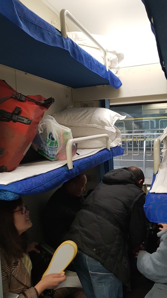 Diesmal hatte ich mir sogar ein Hardbed gebucht, welches eine tolle Entscheidung gewesen war. Sechs Betten in einer Kabine, mit zusätzlichen Sitzmöglichkeiten im Gang. Durch das Bett bekommt man richtige Privatsphäre, Niemand berührt dich die ganze Zeit und es kann sogar richtig entspannt werden. Auch habe ich von meiner ersten Zugfahrt gelernt und einen Becher und Teebeutel organisiert, um von dem heissen Wasser profitieren zu können. Nach gemütlichen 22 Stunden fuhr der Zug in Chengdu ein. Ohne Probleme hätte ich noch eine Nacht mehr im Zug verbringen können.