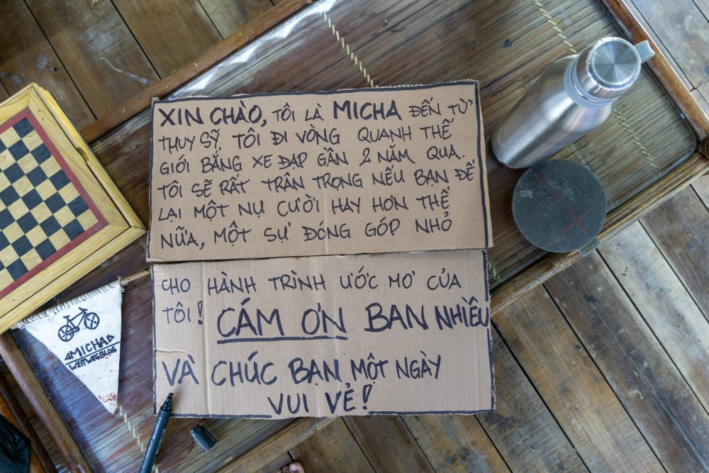 Auf Cat Ba habe ich auf Rat von Leandro mal ausprobiert Musik in den Strassen zu spielen, denn Musik würde immer funktionieren. Und wenn man sich noch ein Schild schreib, was erklärt wie man reist, sorgt dies noch für mehr Aufmerksamkeit. Und Cat Ba ist deswegen auch besonders gut, da es eine Feriendestination ist, also viele Leute herkommen, die es nicht stört ob sie noch einen Dollar mehr oder weniger ausgeben. So verdiente ich in zwei Abende ganze 50 Dollar, was ein beträchtlicher Betrag ist, dadurch konnte ich Locker eine Woche leben. Aber im grosse Stile will ich das trotzdem nicht machen, denn dies würde auch nicht überall so gut funktionieren.