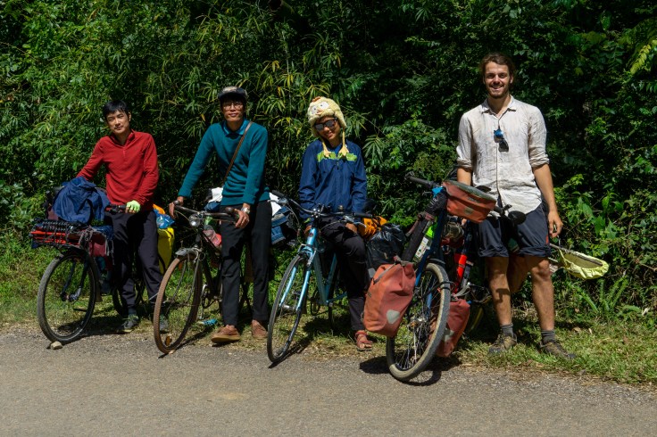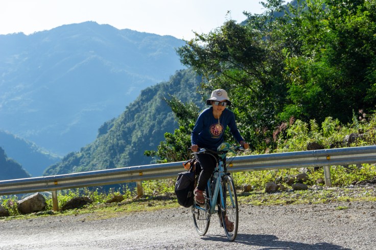 Als wir in Ba Lac ankamen, stießen wir auf Leo, welcher in die andere Richtung unterwegs war. Wir beschlossen eine kleine Expedition zusammen zu machen, denn in der Nähe gab es eine Straße mit vielen Kurven, welche ein schönes Bild ergeben würde. Auch sollte dort laut Hostelbesitzer ein guter Camp Spot sein. Die Räder konnten wir auf Passhöhe bei einem Cafe hineinstellen und für ein paar Dollar dort lassen.