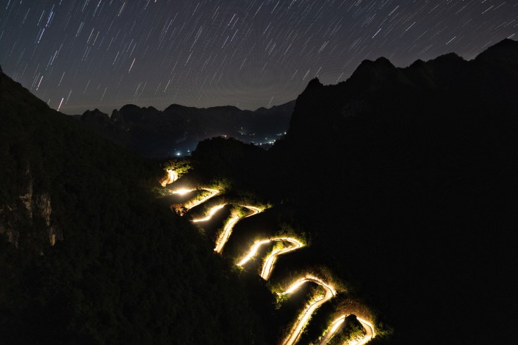 Ich hatte die Idee beim Fotospot eine Langzeitbelichtung von einem Fahrzeug zu machen. Das Licht in der Nacht würde eine schöne Schlange geben. So machte ich mich im Dunklen auf den Weg, um das Bild zu schießen, dies gelang mir auch. Nur leider horizontal, denn in der Nacht sah ich nicht das auch ein Vertikales Bild möglich gewesen wäre. Und somit auf dem Bild anstelle von 11 Kurven, ganze 14 Platz gehabt hätten. Ein alles entscheidender Unterschied. Thao war nicht so begeistert eine Nacht länger zu bleiben und nochmals eine 15 Minütige Wanderung zu machen, für das perfekte Bild zu bekommen. Ich konnte sie dann aber überreden. 🙂 Beim hinuntergehen platzierte ich mein Stativ und richtete die Kamera aus. Das Stativ würde ich hier oben verstecken, somit müsste ich die Form nicht anpassen und es würde leichter sein in der Nacht den gleichen Winkel zu finden.