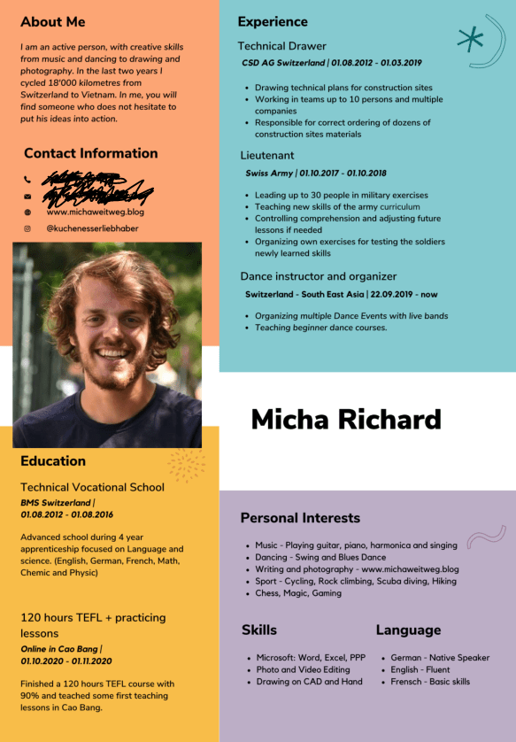 Durch Facebook habe ich einige Kontakte für mögliche Arbeitsplätze bekommen. Alles aber eher unkonkret, oder zu komischen Zeiten. Überraschenderweise, sogar einige Stellen als Deutschlehrer. Ich realisiere es wird Zeit wohl mal wieder einen Lebenslauf zu schreiben, mein alter, welcher ich mit 16 geschrieben habe, ist wohl nicht mehr up to Date.