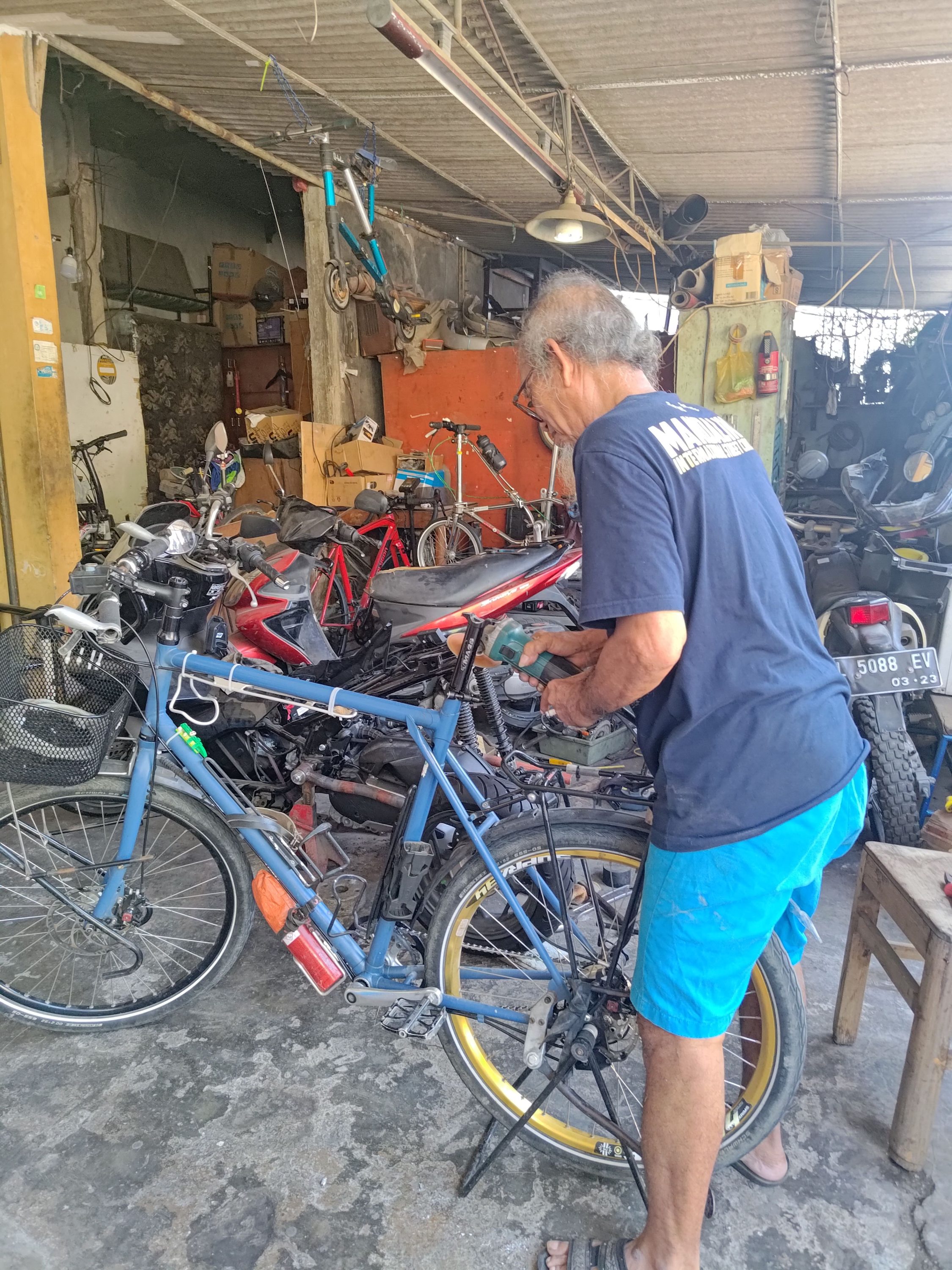 In Surabaya angekommen und beim Laden vorbeigeschaut war schnell klar, mein Sattel ist 2-3 cm zu hoch. Aber dies hat er erst gesehen, als wir zusammen um den Block fuhren. Denn eine Höhenermittlungsrechnung: Innenbeinlänge * 0.89 (oder so^^) ergab, dass mein Sattel eigentlich auf richtiger Höhe sein sollte. So hat er versucht, meine Sattelstange zu lösen. Ging natürlich nicht. Er gab mir den Kontakt eines Mannes, der mir helfen kann. So fuhr ich rüber. „Ja, ich kann dir helfen, komm am Montag wieder.“